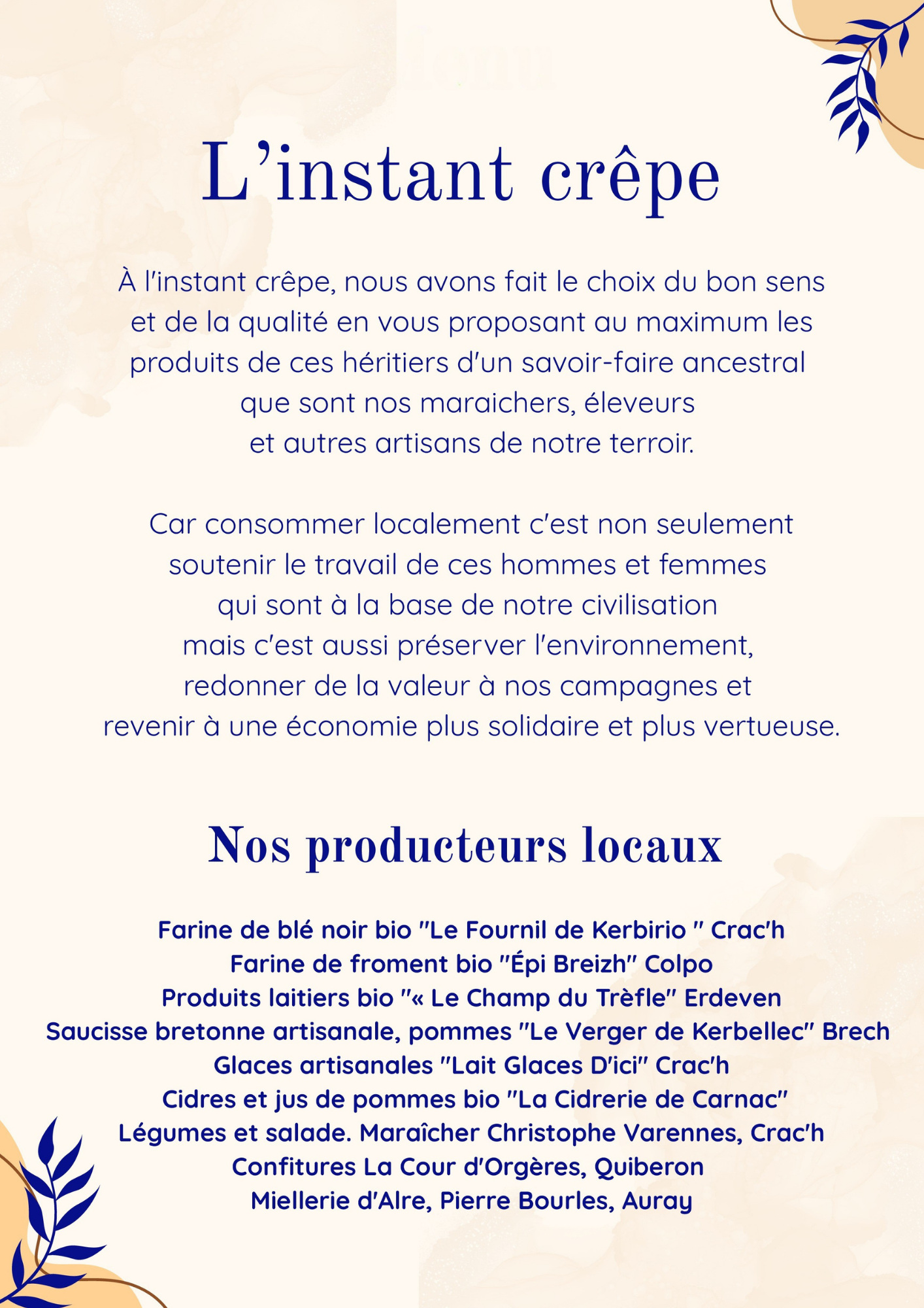 Envie d’une vraie pause gourmande ? L’Instant Crêpe vous accueille autour de crêpes et galettes préparées avec soin, à partir de bons produits locaux de la région carnacoise, dans le respect de la tradition bretonne. Des recettes généreuses, une cuisine maison, une ambiance chaleureuse : ici, tout est réuni pour passer un vrai bon moment.